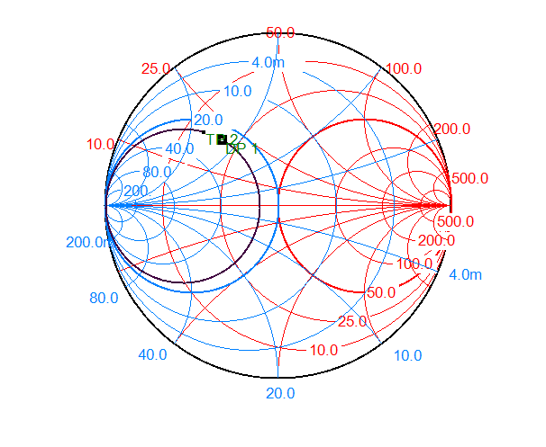 However, if we want to match a load impedance using a double-stub network with two stubs spaced λ/4 (at 1GHz). Then it is impossible, because we can’t make an intersection point on the unity-normalized-resistance circle just by inserting a shunt stub. It means all the load points(resistance less than 50Ω) within the unity-normalized-conductance circle can not be matched using such kind of network. We have to insert a series line to move this point out of that circle first.